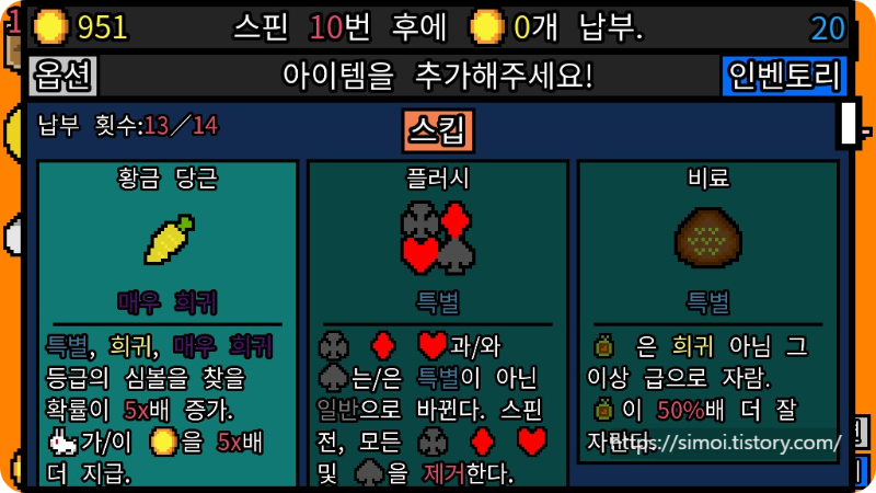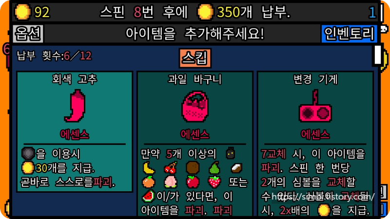 너무한 집주인을 피해서 최고층까지 올라가보자 집주인이 너무해는 슬롯머신과 덱 빌딩 요소가 결합된 로그라이크 스타일의 인디 게임이다. 이 게임은 슬롯머신을 통해 심볼
