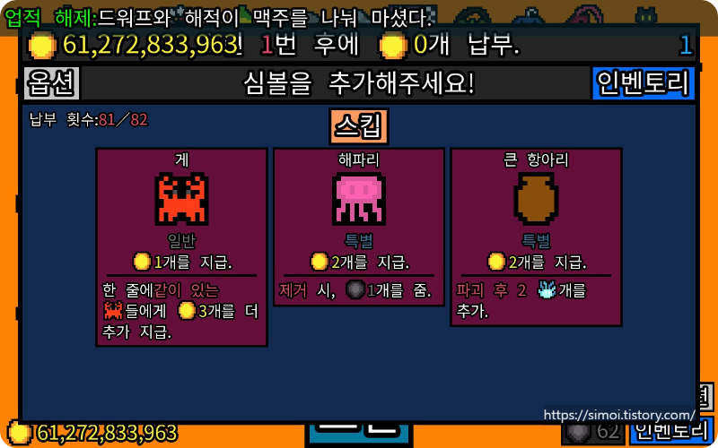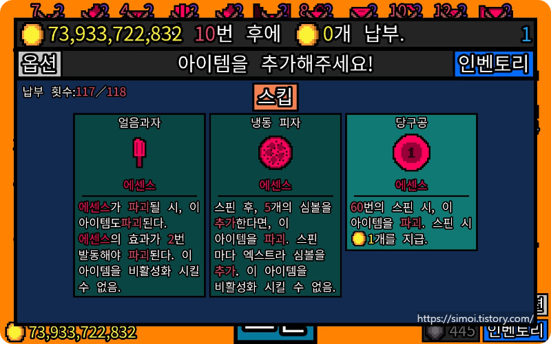 마이너스 코인을 주는 심볼(까마귀, 까치)에서 흡수의 저주가 발동됩니다