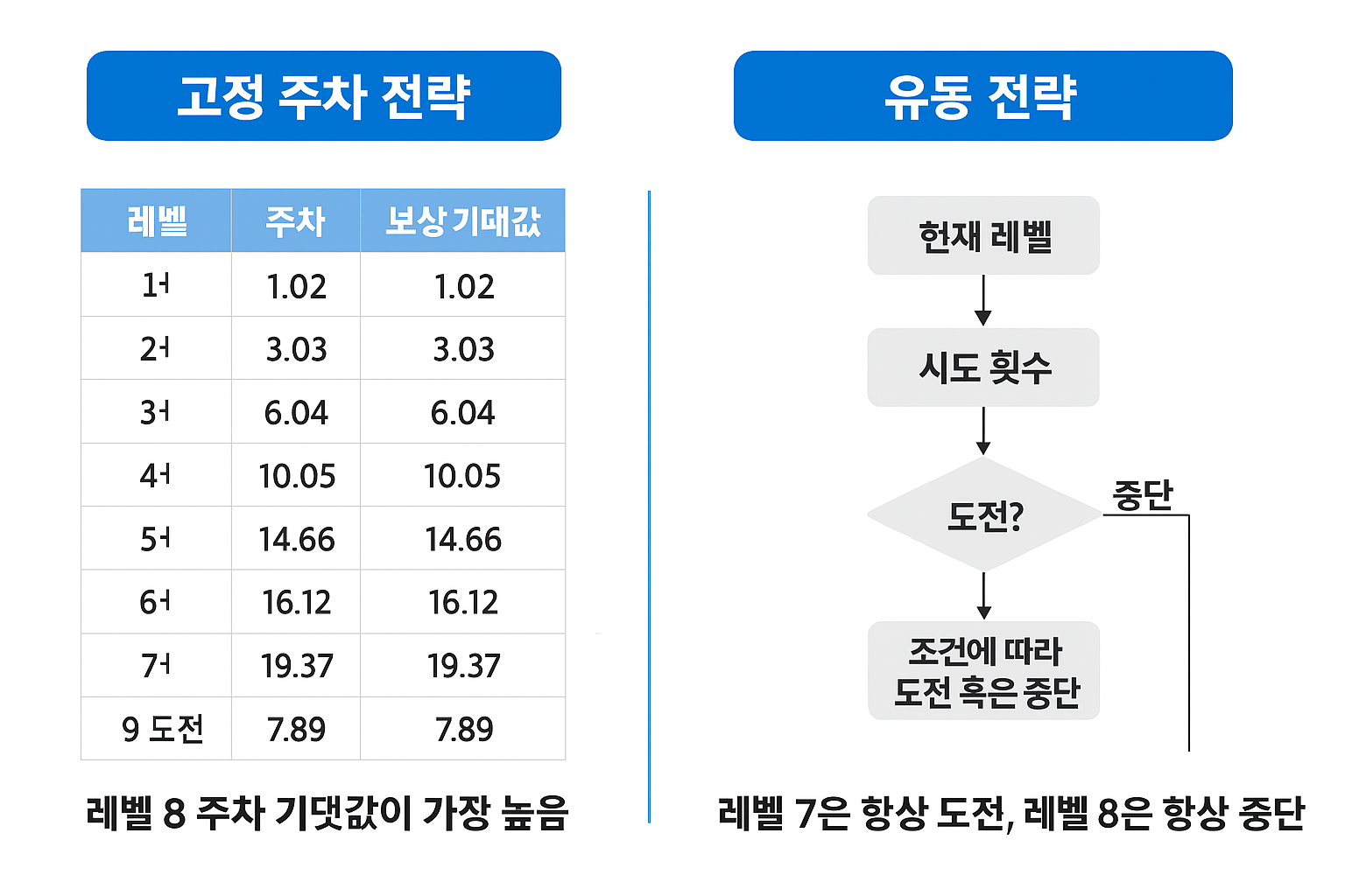 “동(적응형) 전략: 남은 시도/현재 레벨에 따라 중간에 전략을 바꾸는 방식